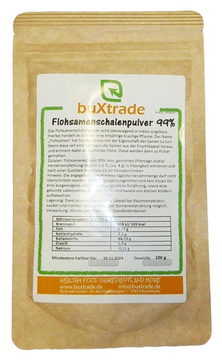 Flohsamenschalenpulver 99% rein von Buxtrade. Pflanzlicher Ballaststoff für die Verwendung z.B. bei Brot- und Gebäckteig. Die Fasern der Flohsamen sind wie ein Quellstoff, der die Feuchtigkeit besser im Teig hält und ihn so geschmeidiger macht. Glutenfreie Brote, Brötchen & Gebäck krümeln so deutlich weniger und trocknen nicht so schnell aus. Macht Teige saftig, formbar und ausrollbar.