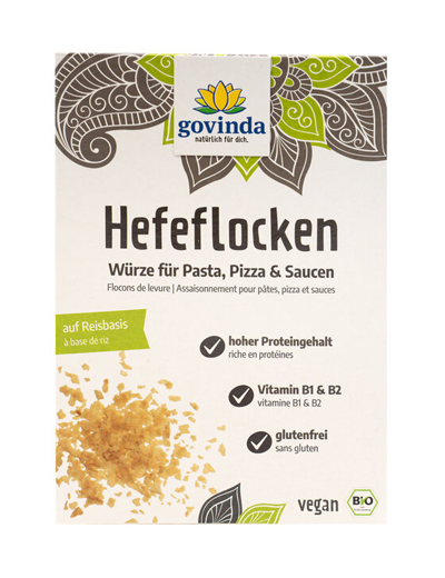 Die vegane und glutenfreie Bio Hefeflocken von govinda. Die Hefeflocken sind inaktive, getrocknete Hefezellen, die in der veganen und vegetarischen Küche als würziger Käseersatz und Geschmacksverstärker beliebt sind und eignen sich somit perfekt zum Backen von glutenfreien Waren.