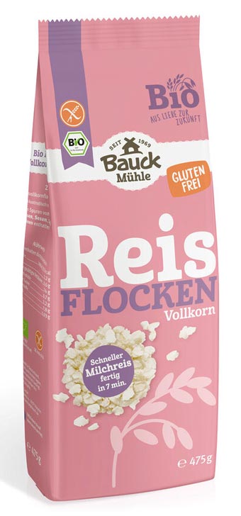 Bio Reisflocken Vollkorn von Bauck Mühle. Ideal zur Herstellung von glutenfreien Breien, zum Frühstück mit Milch, Saft oder Quark, oder zum Backen von glutenfreien Brot, Brötchen, Keksen und Müsliriegeln.