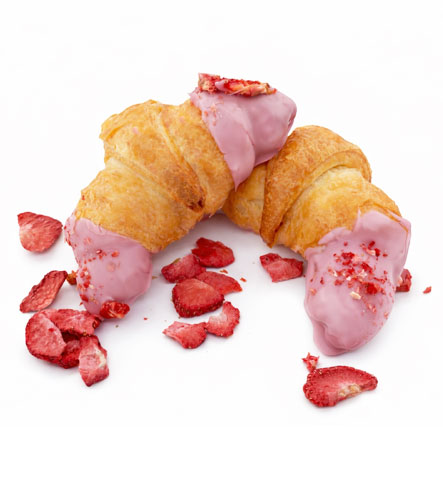Glutenfreie Erdbeer-Croissants 2 Stück, frisch gebacken von The Lucky Grain. Glutenfreies Buttercroissant mit Ganache-Füllung und getrockneten Erdbeeren.