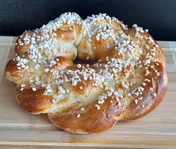 Glutenfreier Osterkranz mit Hagelzucker, frisch gebacken von SZ-glutenfrei aus eigener Herstellung. Osterkranz mit Hagelzucker bestreut.