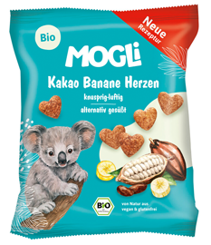 Glutenfreie Bio Kakao Banane Herzen von Mogli. Gepuffter Bio Maissnack mit Kakao- und Bananenpulver.