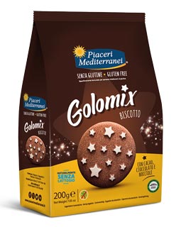 Golomix Biscotto von Piaceri Mediterranei, sind glutenfreie Kekse mit Kakao, Haselnuss und mit Zuckersternen dekoriert.