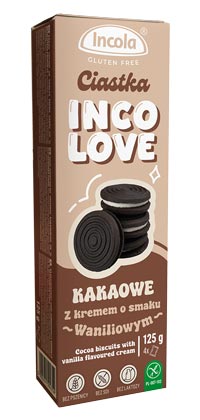 Kakaokekse mit Vanille-Creme von Incola sind leckere glutenfreie Doppelkekse mit 26% Vanillefüllung.