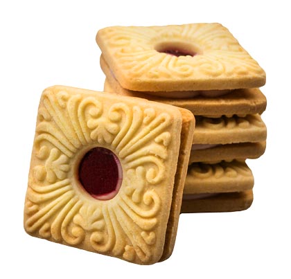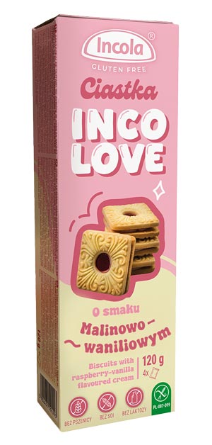 Glutenfreie Kekse mit Himbeer-Vanille-Creme von Incola, sind leckere glutenfreie Kekse mit 16% Himbeer-Vanille-Creme und 9% Himbeerfüllung.