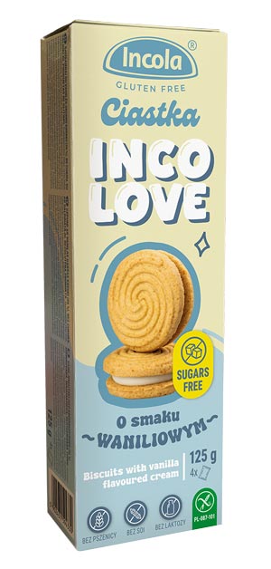 Glutenfreie Kekse ohne Zuckerzusatz mit Vanille-Creme von Incola, sind leckere glutenfreie Doppelkekse mit 26% Vanillefüllung.