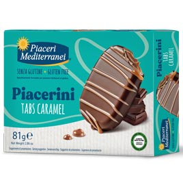 Piacerini Tabs Caramel von Piaceri Mediterranei sind glutenfreie Waffeln mit einer Karamellfüllung.