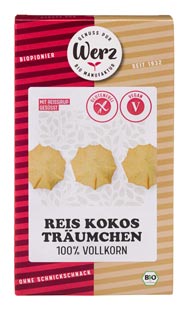 Reis Kokos Träumchen von Werz. Leckere glutenfreie Vollkornkekse mit Reissirup gesüßt, diese werden in liebevoller Handarbeit hergestellt!