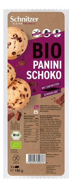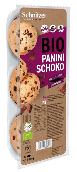 Bio Panini Schoko von Schnitzer. Glutenfreie Schokobrötchen mit feinen Zartbitter-Schokostückchen.
