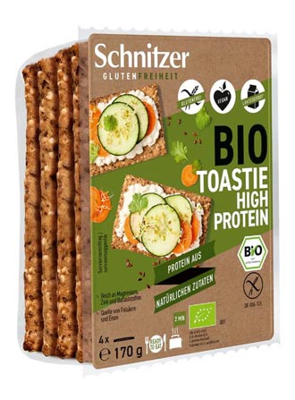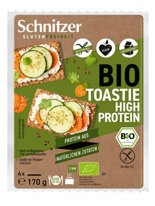 Bio Toastie High Protein von Schnitzer. Glutenfreies eiweißreiches Bio Toastbrötchen mit Sonnenblumenmehl zum Toasten oder Direktverzehr.