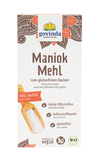 Das vegane und glutenfreie Bio Maniokmehl von govinda. Das Maniokmehl ist die beste Alternative zu herkömmlichem Weizenmehl und eignet sich somit perfekt zum Backen von glutenfreien Waren.