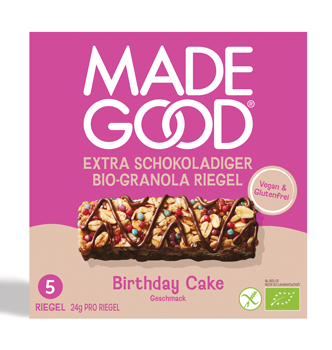 Die Bio-Granola-Riegel von MadeGood mit „Birthday Cake“ sind mit Schokolade überzogen und enthalten knusprige Stückchen. Diese glutenfreien Riegel eignen sich hervorragend als Frühstück, Mittagssnack oder für den kleinen Hunger zwischendurch – auch unterwegs. Dank der enthaltenen Gemüseextrakte bieten sie eine wertvolle Quelle für Ballaststoffe.