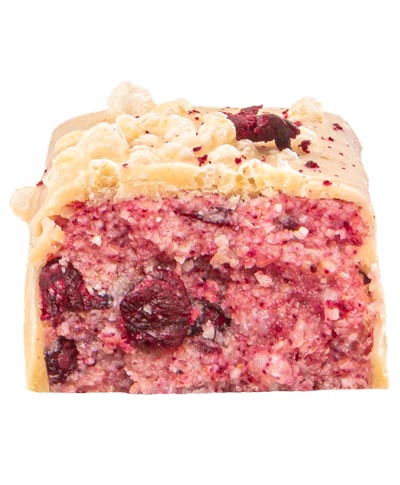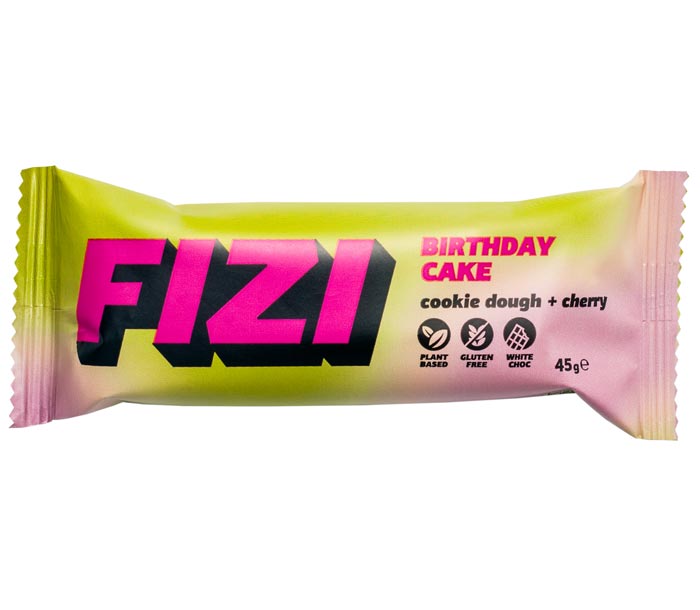Der Birthday Cake Riegel von Fizi ist frei von Industriezucker. Ein knuspriger Boden, umhüllt von feiner Schokolade, trifft auf eine fruchtige Kirschkomponente mit dezenter Säure. Das Ergebnis: ein ausgewogenes Geschmackserlebnis mit raffiniertem Twist.