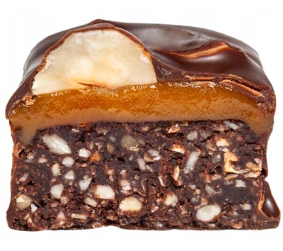 Haselnüsse (40 %), Karamellfüllung (19,6 %) (Kokosnussextrakt, Apfelsaftkonzentrat, Maisstärke), glutenfreie Haferflocken, zuckerfreie Schokolade (12,2 %) (Kakaomasse, Süßungsmittel: Maltit, Kakaobutter, fettarmes Kakaopulver, Sheabutter, Emulgator: Sojalecithin, natürliches Vanillearoma), Kakaopulver (7,8 %), Kakaobutter, Apfelsaftkonzentrat, Kokosöl
