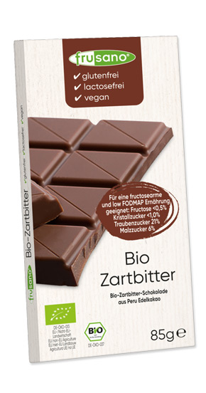 Bio Zartbitterschokolade fructosearm vegan von Frusano. Bio Traubenzucker Schokolade für Zartbitter-Liebhaber und zusätzlich vegan. Die Bio Zartbitterschokolade von Frusano ist nur mit Traubenzucker und Malzzucker gesüßt. Sie ist nicht nur laktosefrei, sondern auch vegan und glutenfrei und bietet Ihnen puren, unverfälschten Schokoladengenuss.