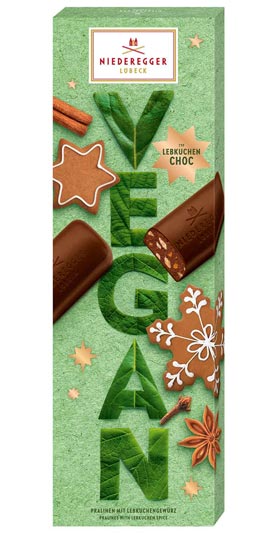Die Niederegger Vegan Lebkuchen Choc. Glutenfreie Pralinen mit Lebkuchengewürz, Gewürz-Kakocreme-Füllung (57 %) in Zartbitter-Schokolade.