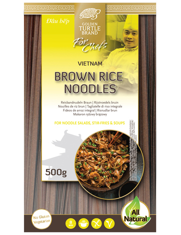 Glutenfreie Braune Reisnudeln von Golden Turtle Brand sind 3 mm breite Bandnudeln.