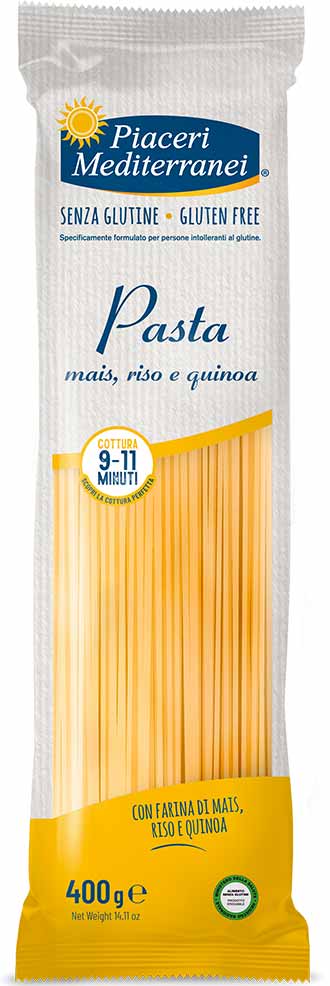 Glutenfreie Nudeln Spaghetti aus Reis, Mais und Quinoa von Piaceri Mediterranei. Eine glutenfreie Pasta-Alternative mit feiner, leicht nussiger Note und angenehmer Konsistenz – perfekt für vielseitige und köstliche Gerichte. Kochzeit 9-11 Minuten.