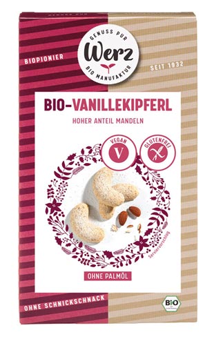 Glutenfreie Bio Vanillekipferl von Werz. Die glutenfreien Vanillekipferl mit einem hohen Anteil an Mandeln sind glutenfrei, laktosefrei & vegan.
