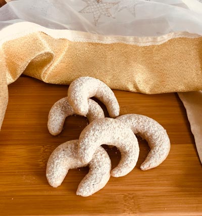 Glutenfreie Vanillekipferl von SZ-glutenfrei. Glutenfreies Weihnachtsgebäck in Kipferlform aus Mürbteig, mit Vanillearoma. Alle glutenfreien Plätzchen, Lebkuchen und Weihnachtsgebäck werden in liebevoller Handarbeit hergestellt!